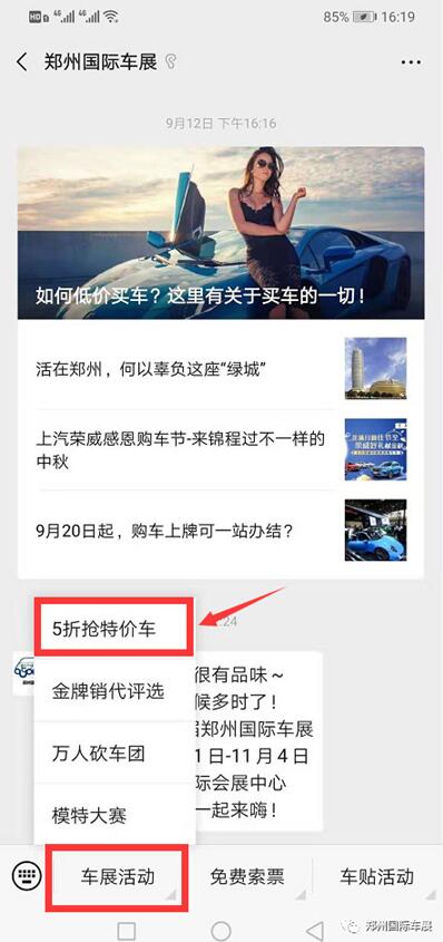 ◆关注【郑州国际车展】官方微信,选择【车展活动】菜单,点击【5折抢特价车】,即可参与抢特价车活动,选择意向特价车型,获得专属抢特价车资格券,保存券号,车展期间随机抽取,成为准车主。